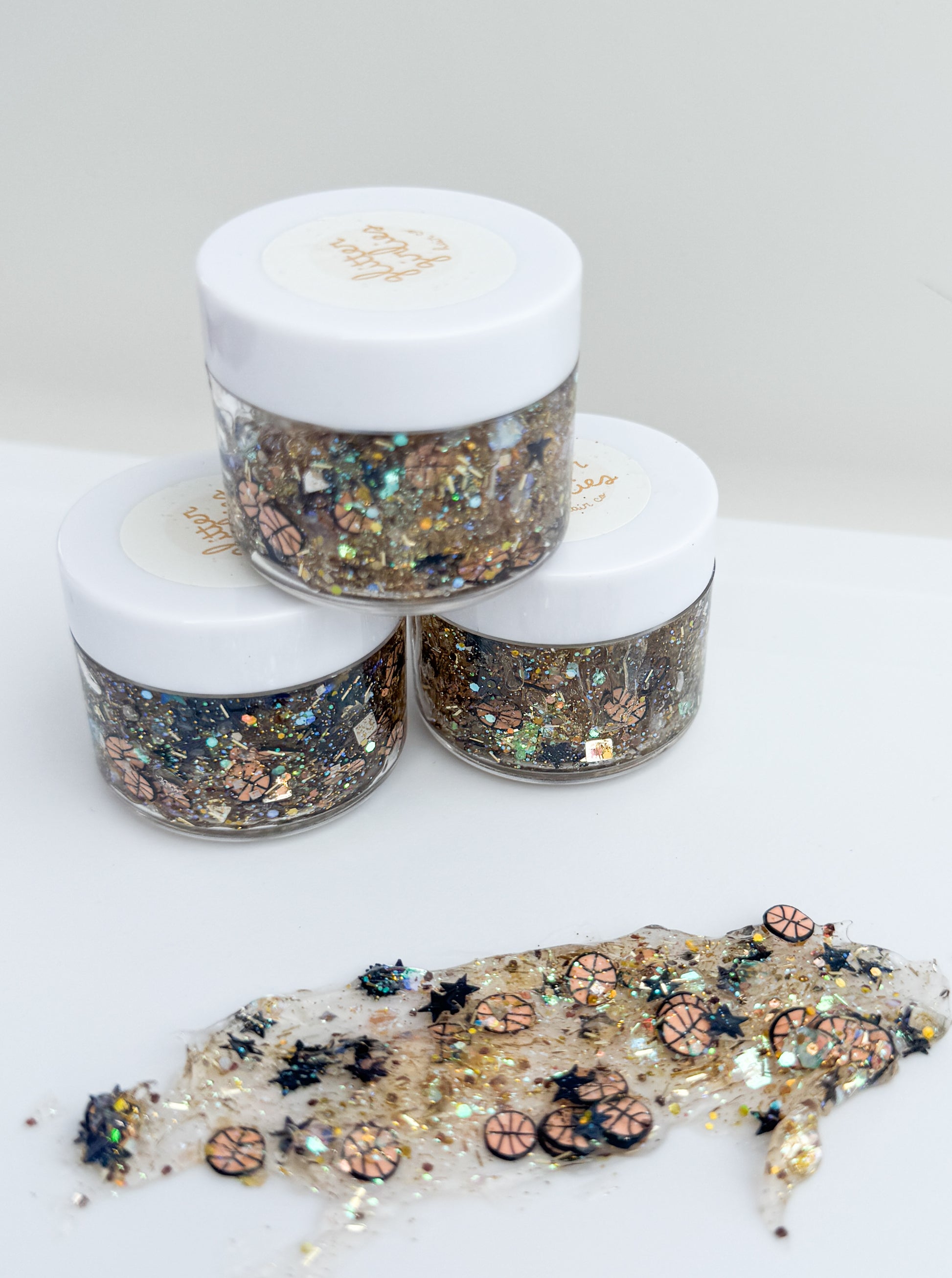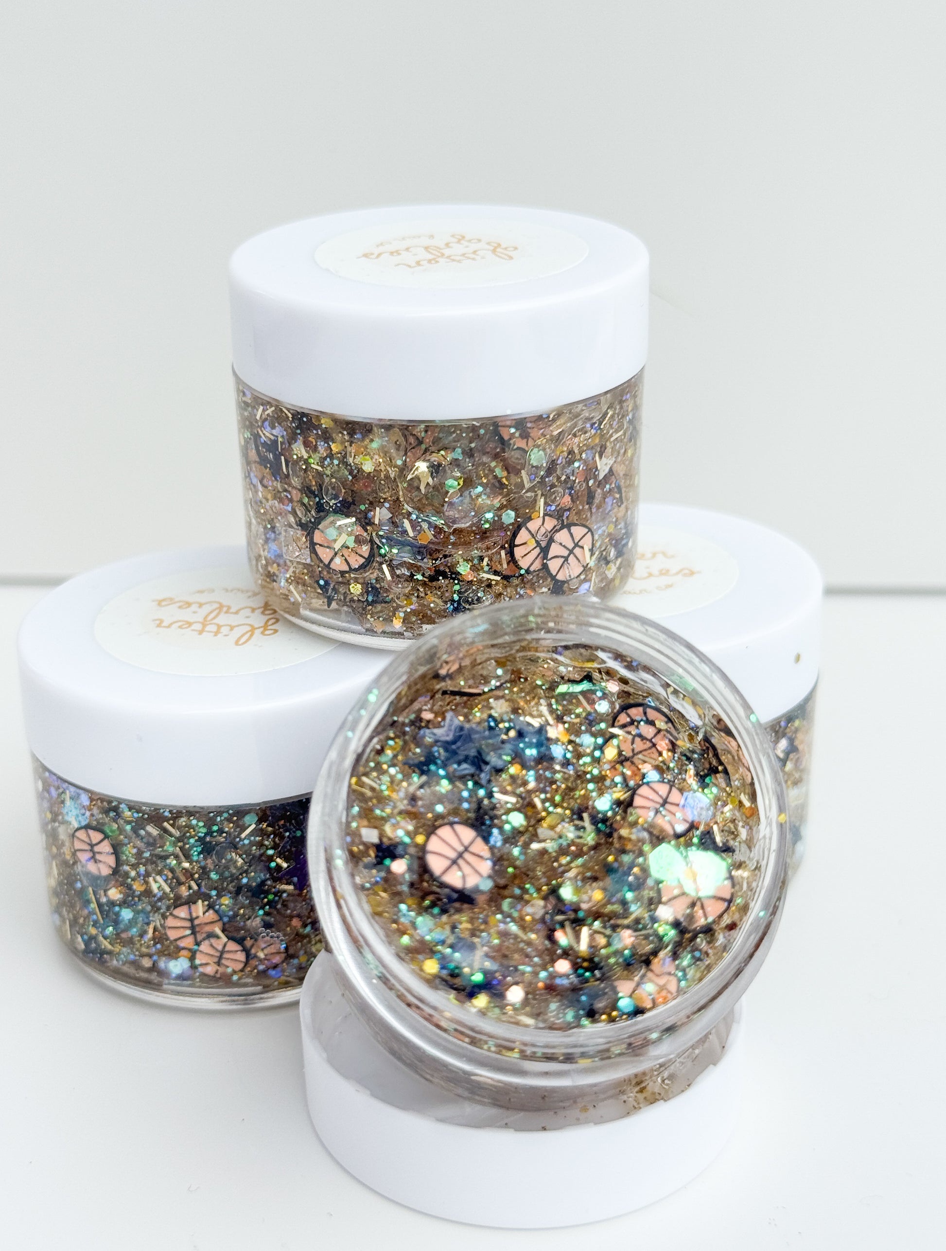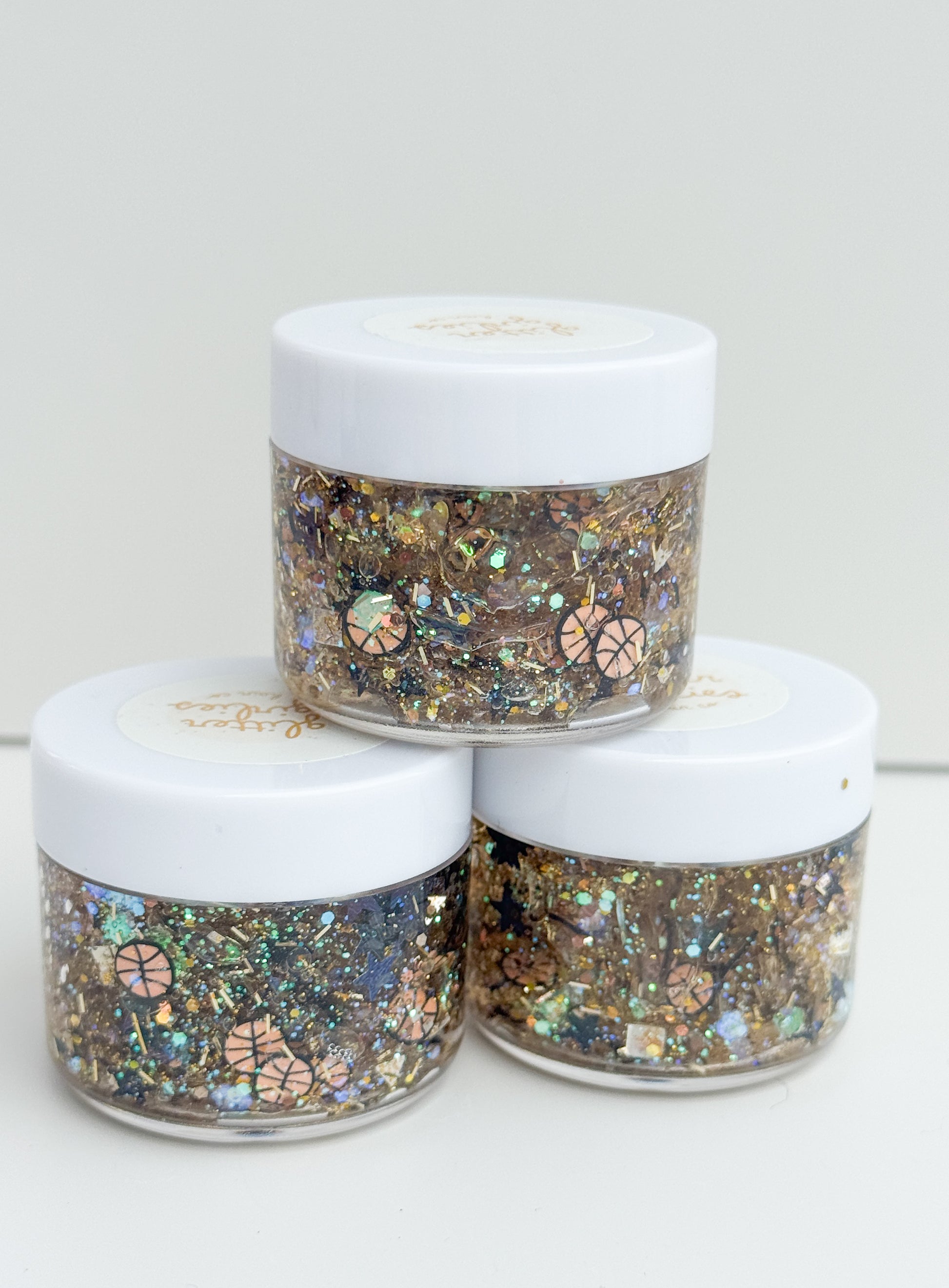 Miss Slam Dunk is the ultimate glitter blend for athletes, fans, and game-day glam queens who love to shine under the lights! Featuring tiny basketball clay pieces, a bold gold glitter base, and black star accents, this mix scores major points for style, spirit, and sparkle. Perfect for cheerleaders, players, and sports-loving girlies who like their look fierce, fun, and fabulous. π